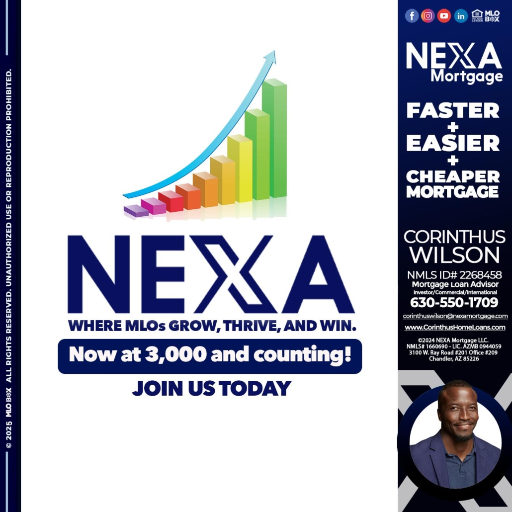 3,000 MLOs - Corinthus Wilson -Mortgage Loan OriginatorHi, my name is Corinthus Wilson. I’m a Loan Officer with NEXA Mortgage LLC., offering personalized mortgage solutions, fast customized quotes, great rates and service with integrity.