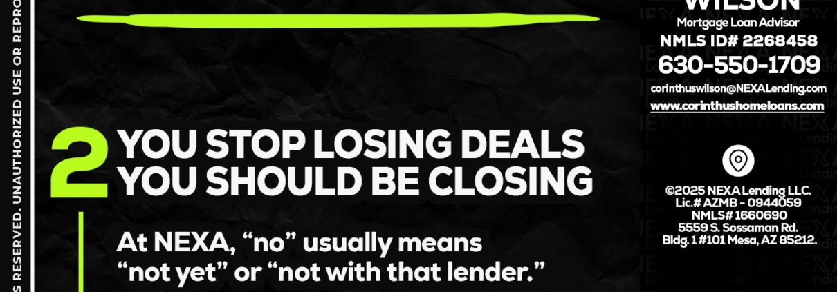Hi, my name is Corinthus Wilson. I’m a Loan Officer with NEXA Lending LLC., offering personalized mortgage solutions, fast customized quotes, great rates and service with integrity.
