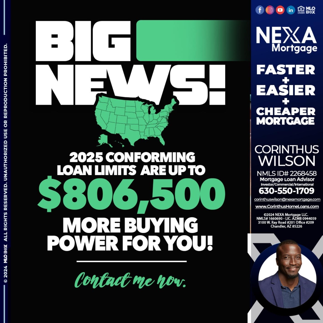 BIG NEWS - Corinthus Wilson -Mortgage Loan OriginatorHi, my name is Corinthus Wilson. I’m a Loan Officer with NEXA Mortgage LLC., offering personalized mortgage solutions, fast customized quotes, great rates and service with integrity.