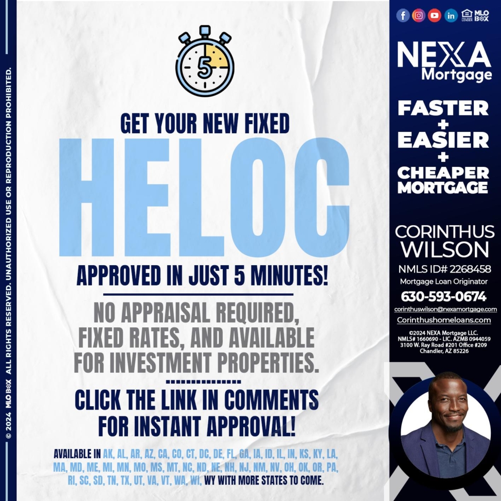 Hi, my name is Corinthus Wilson. I’m a Loan Officer with NEXA Mortgage LLC., offering personalized mortgage solutions, fast customized quotes, great rates and service with integrity.