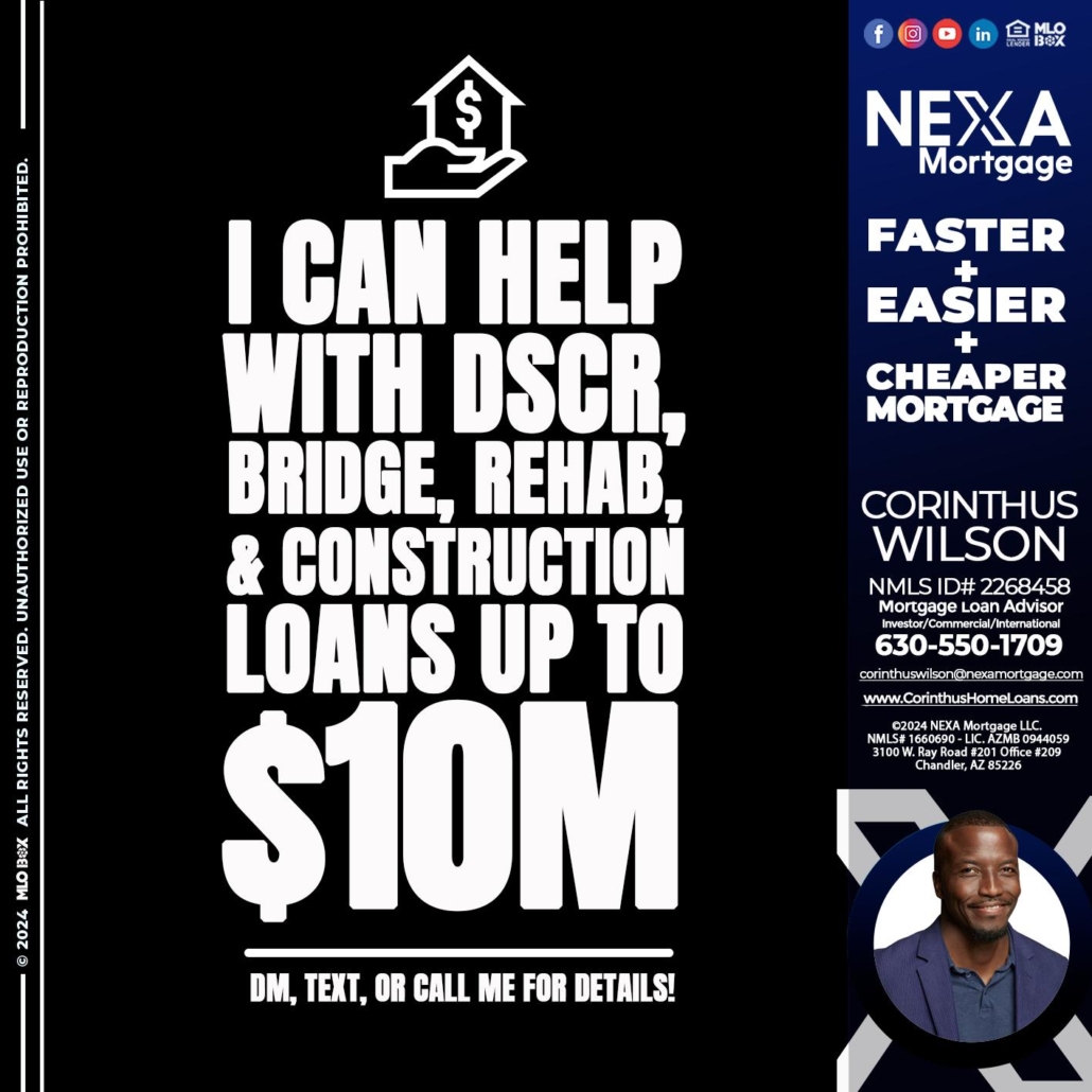 Hi, my name is Corinthus Wilson. I’m a Loan Officer with NEXA Mortgage LLC., offering personalized mortgage solutions, fast customized quotes, great rates and service with integrity.
