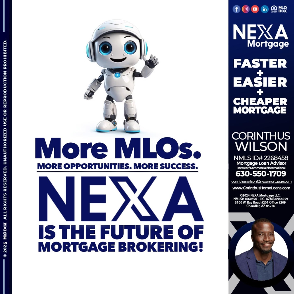 Hi, my name is Corinthus Wilson. I’m a Loan Officer with NEXA Mortgage LLC., offering personalized mortgage solutions, fast customized quotes, great rates and service with integrity.