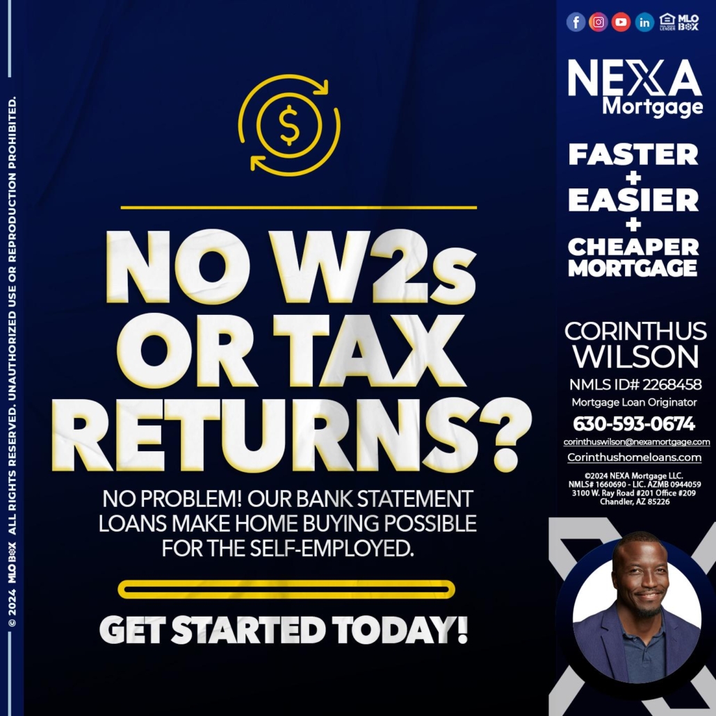 NO W2s - Corinthus Wilson -Mortgage Loan OriginatorHi, my name is Corinthus Wilson. I’m a Loan Officer with NEXA Mortgage LLC., offering personalized mortgage solutions, fast customized quotes, great rates and service with integrity.