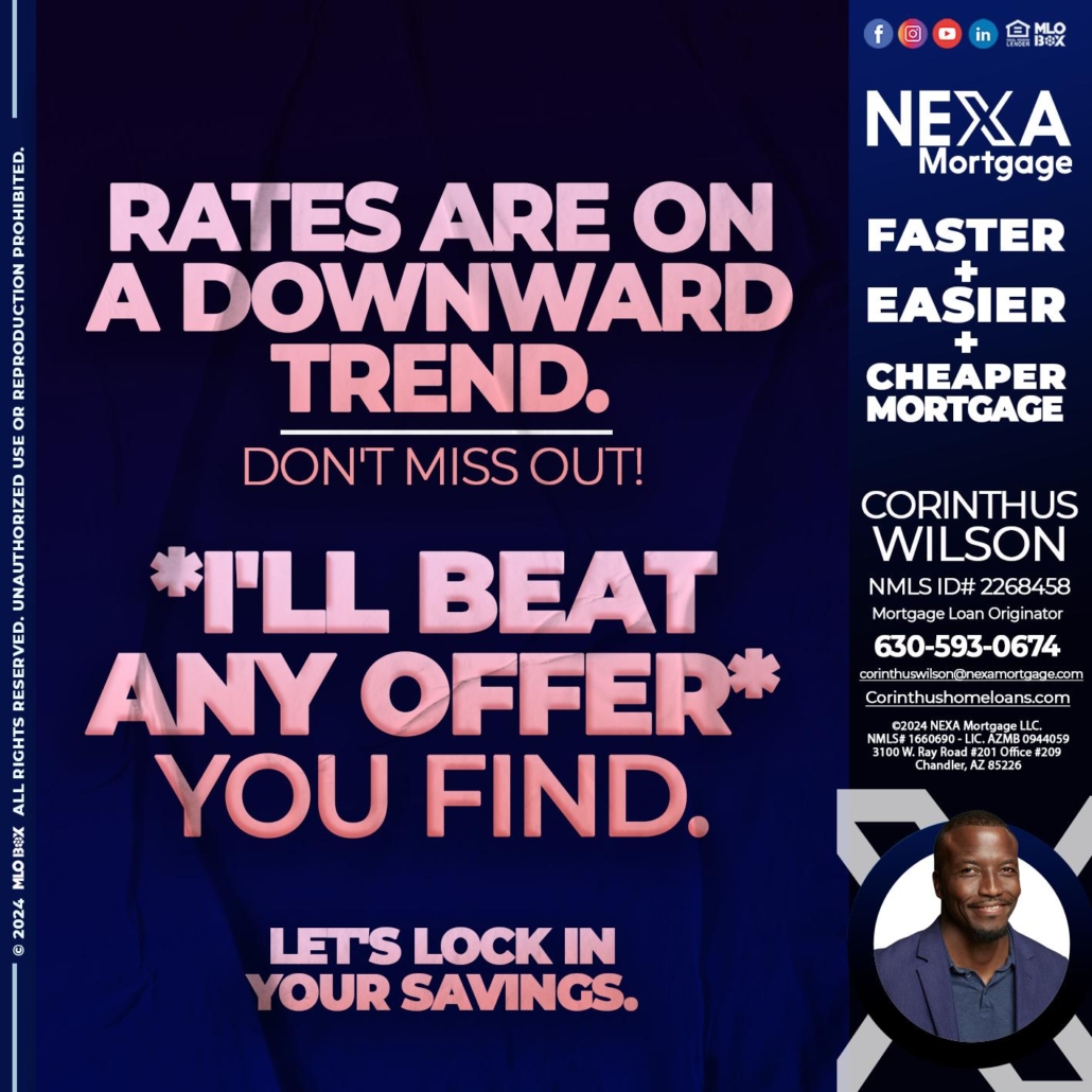 RATES - Corinthus Wilson -Mortgage Loan OriginatorHi, my name is Corinthus Wilson. I’m a Loan Officer with NEXA Mortgage LLC., offering personalized mortgage solutions, fast customized quotes, great rates and service with integrity.