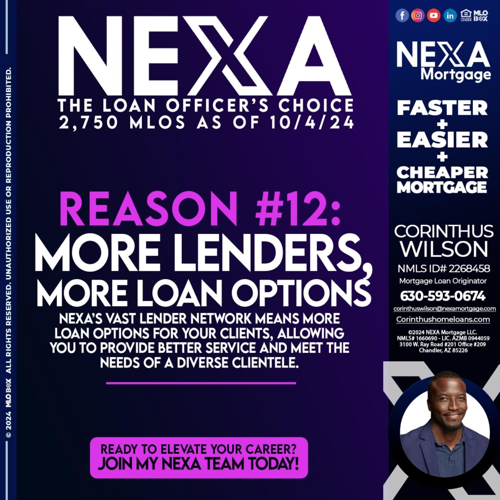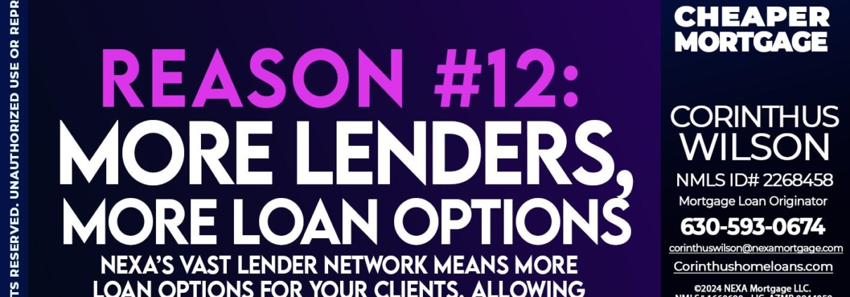 REASON 12 CHOICE - Corinthus Wilson -Mortgage Loan OriginatorHi, my name is Corinthus Wilson. I’m a Loan Officer with NEXA Mortgage LLC., offering personalized mortgage solutions, fast customized quotes, great rates and service with integrity.