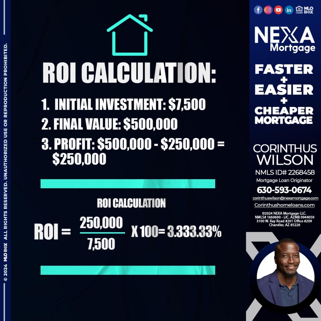 ROI CALCULATION - Corinthus Wilson -Mortgage Loan OriginatorHi, my name is Corinthus Wilson. I’m a Loan Officer with NEXA Mortgage LLC., offering personalized mortgage solutions, fast customized quotes, great rates and service with integrity.