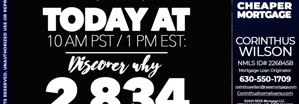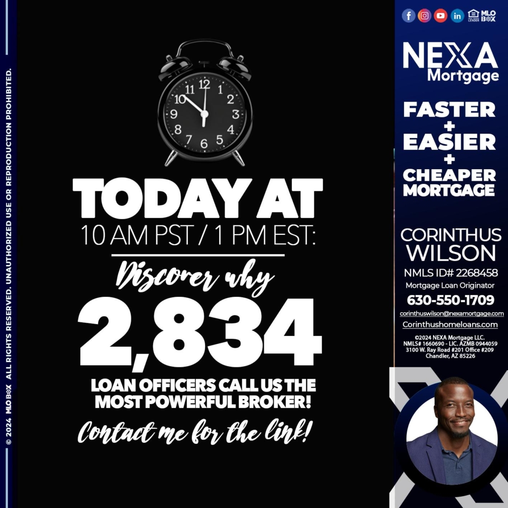 TODAY WHY NEXA - Corinthus Wilson -Mortgage Loan OriginatorHi, my name is Corinthus Wilson. I’m a Loan Officer with NEXA Mortgage LLC., offering personalized mortgage solutions, fast customized quotes, great rates and service with integrity.