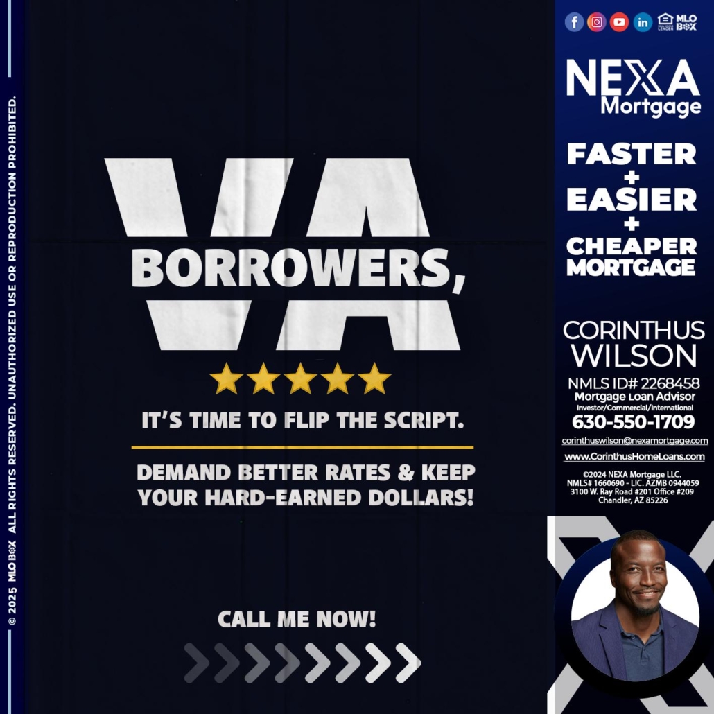 VA BORROWERS - Corinthus Wilson -Mortgage Loan OriginatorHi, my name is Corinthus Wilson. I’m a Loan Officer with NEXA Mortgage LLC., offering personalized mortgage solutions, fast customized quotes, great rates and service with integrity.