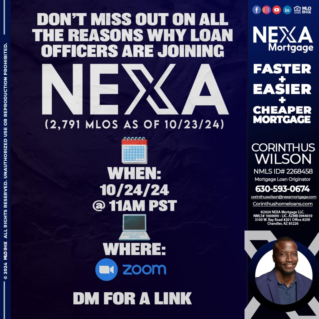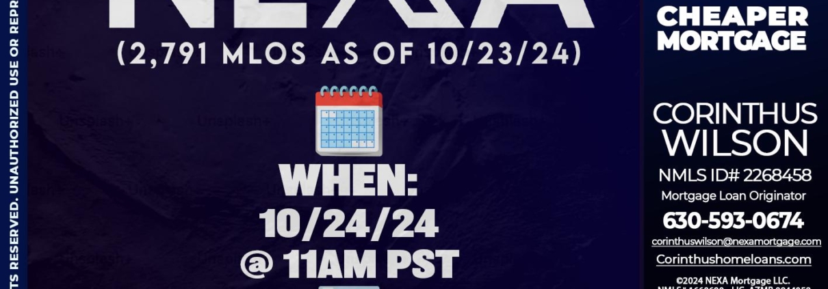 Hi, my name is Corinthus Wilson. I’m a Loan Officer with NEXA Mortgage LLC., offering personalized mortgage solutions, fast customized quotes, great rates and service with integrity.